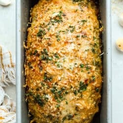 Meet your new favorite meatloaf! The ground chicken makes the Garlic Parmesan Chicken Meatloaf super moist, and you’ll love the Parmesan herb-crusted topping!